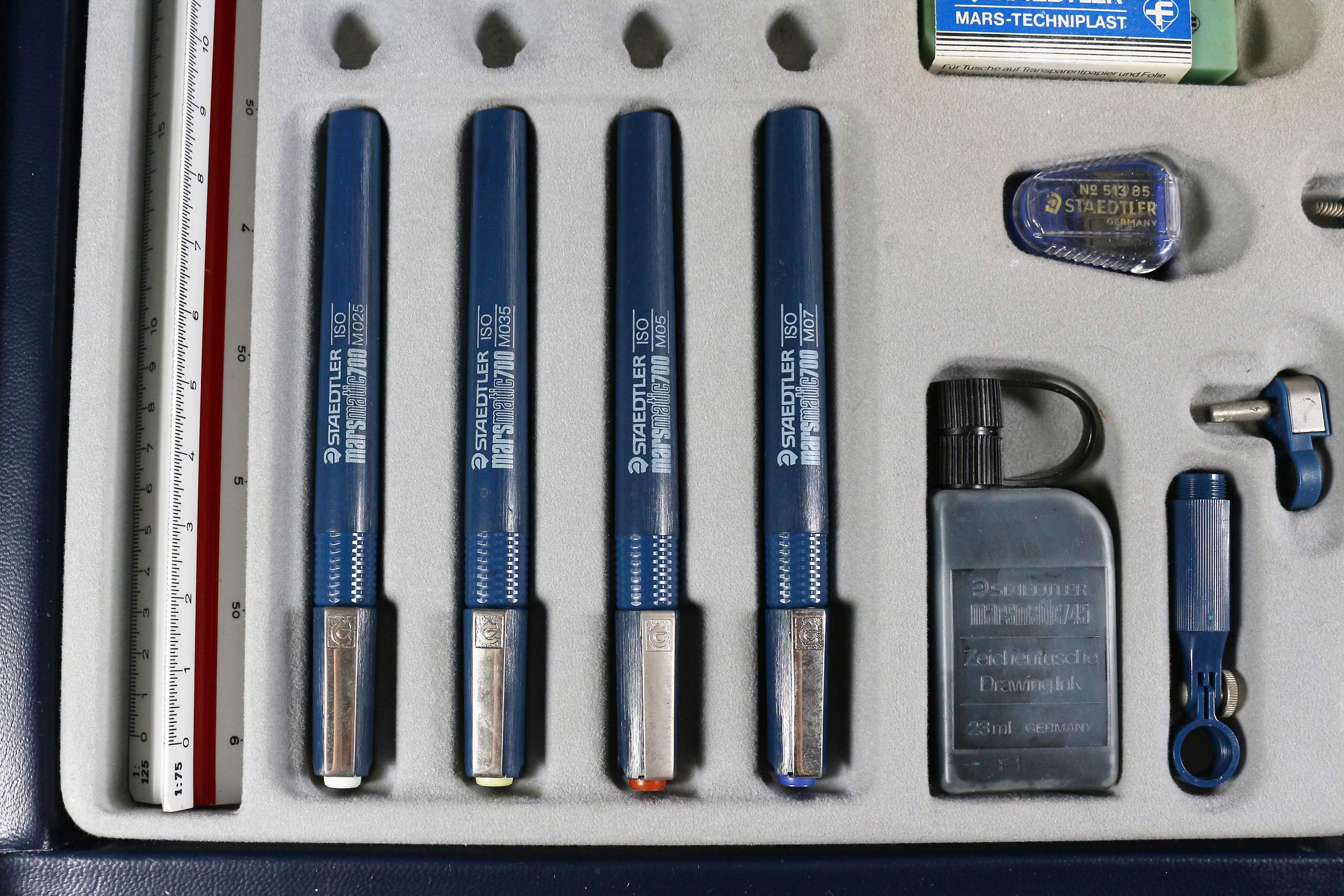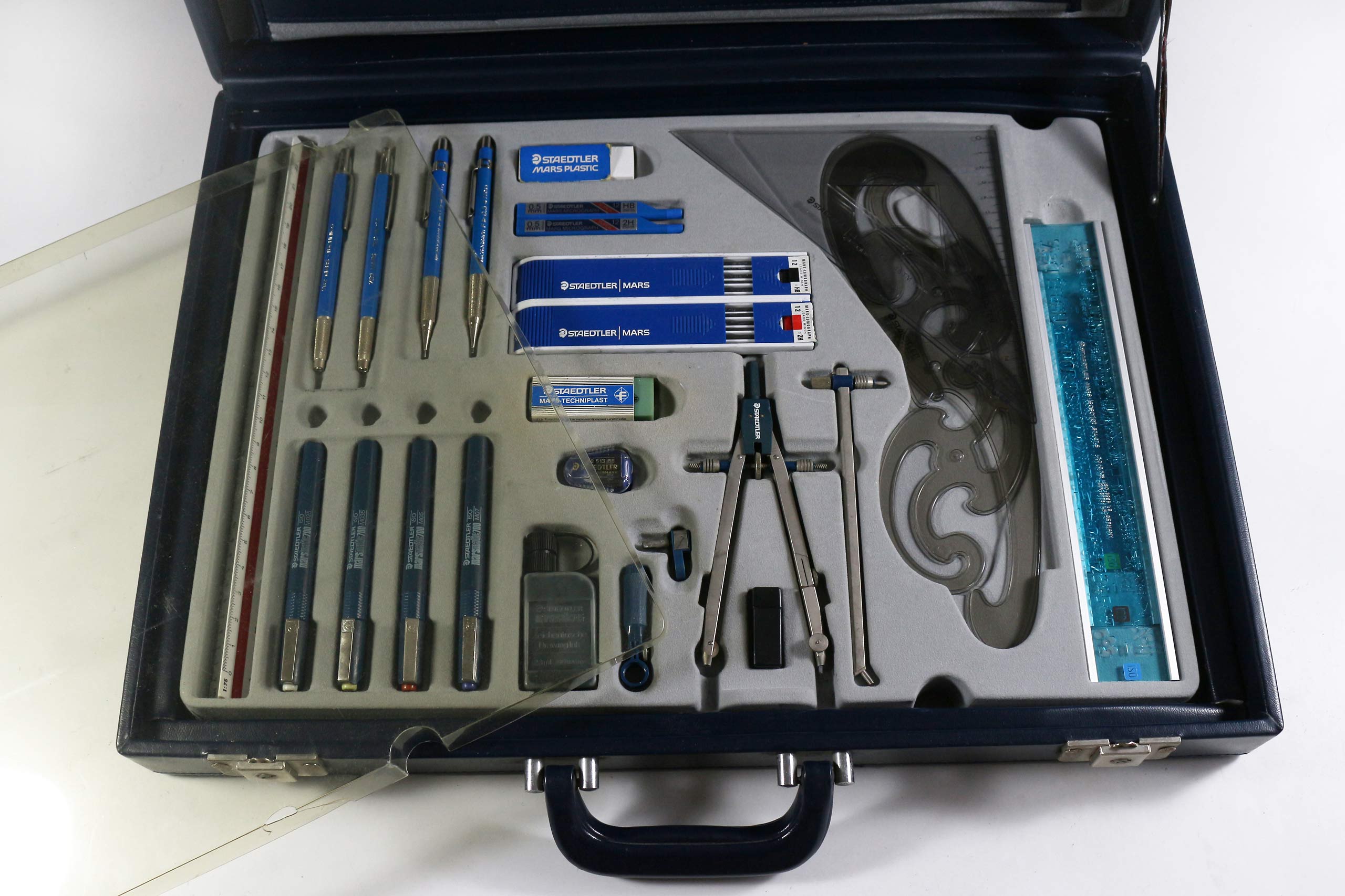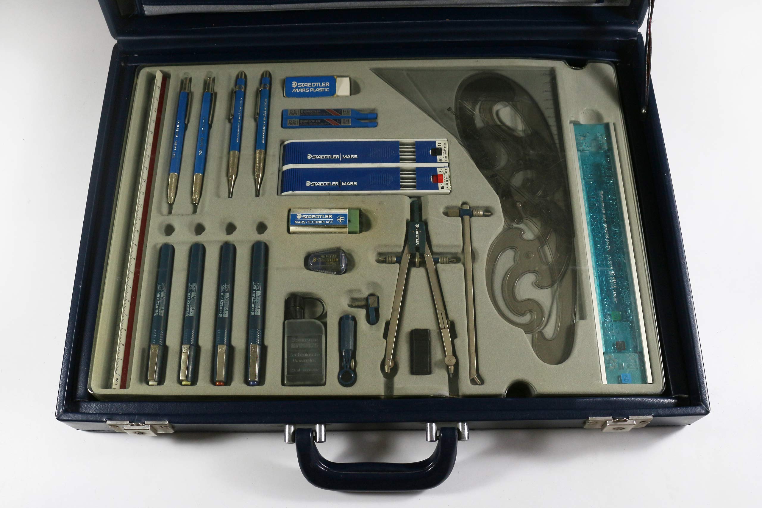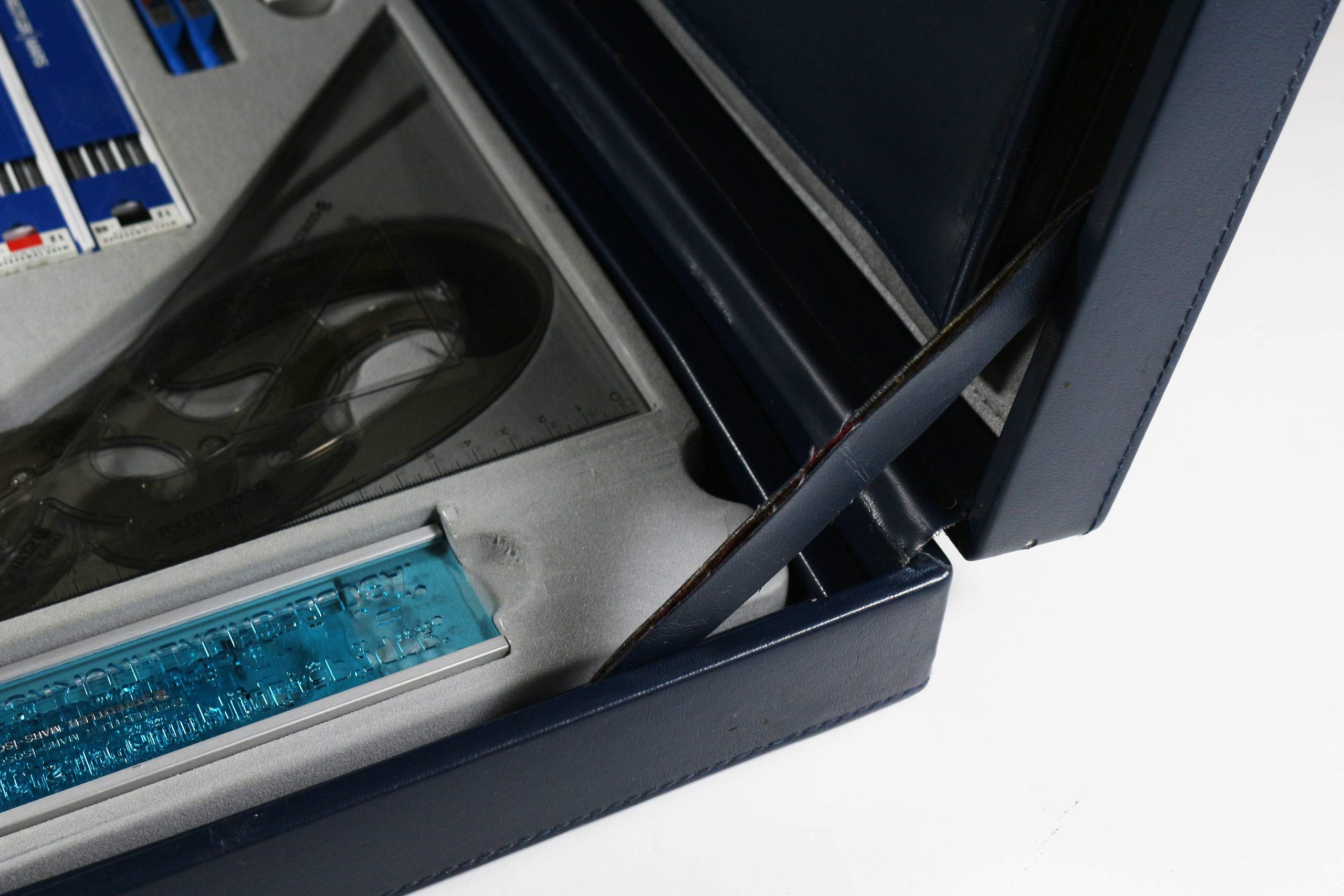 As a slightly smaller size of briefcase was used for the A4 model, the drawing instruments were arranged across two trays, with the drawing board sitting within a recess on top. For added compactness, the Marsmatic technical pens were included as a boxed set, rather than the custom tray design and pen station of the larger case seen below.