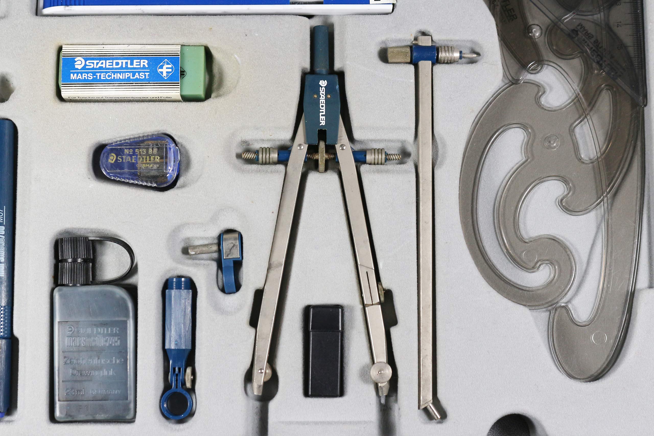 Aside from a couple of missing items, very little of the contents of my case seem to have had any real use. The one exception to this is the Superbow compass itself, which has taken a bit of a beating. On closer inspection, there is something else odd about this compass: namely the orientation of the Staedtler logo on its plastic head. Almost every iteration of the Superbow, not to mention Staedtler’s other compass ranges, has the text running from bottom to top, towards the handle. In this case, it runs in the opposite direction.